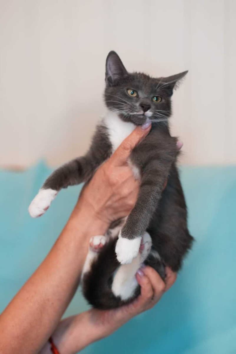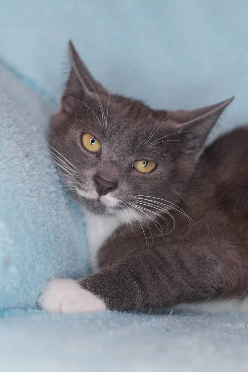 Голубой и бело-лапый Кефирчик — метис русской голубой.