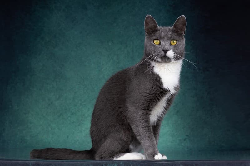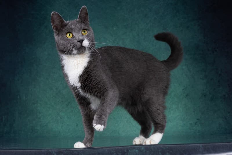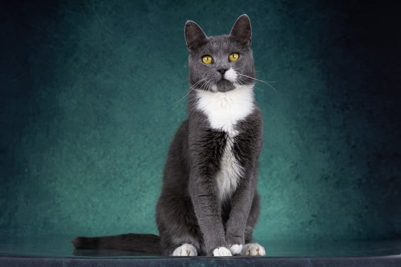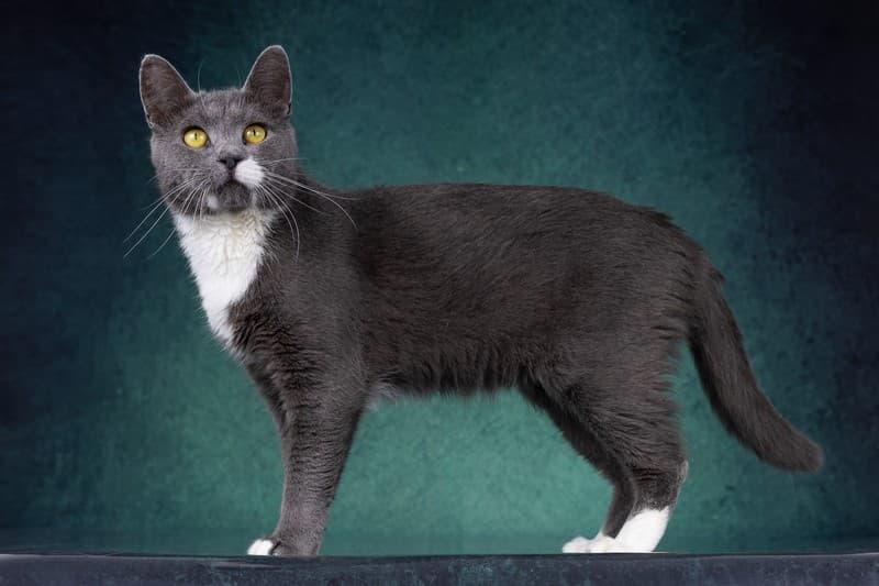 Нежного, серо-голубого окраса с белой манишкой и носочками.