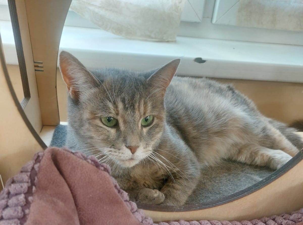 Ей примерно 3 года. Найдена в крайне истощённом состоянии, откормлена, сейчас совершенно здорова, стерилизована, анализы на инфекции отрицательные. Характер нордический.