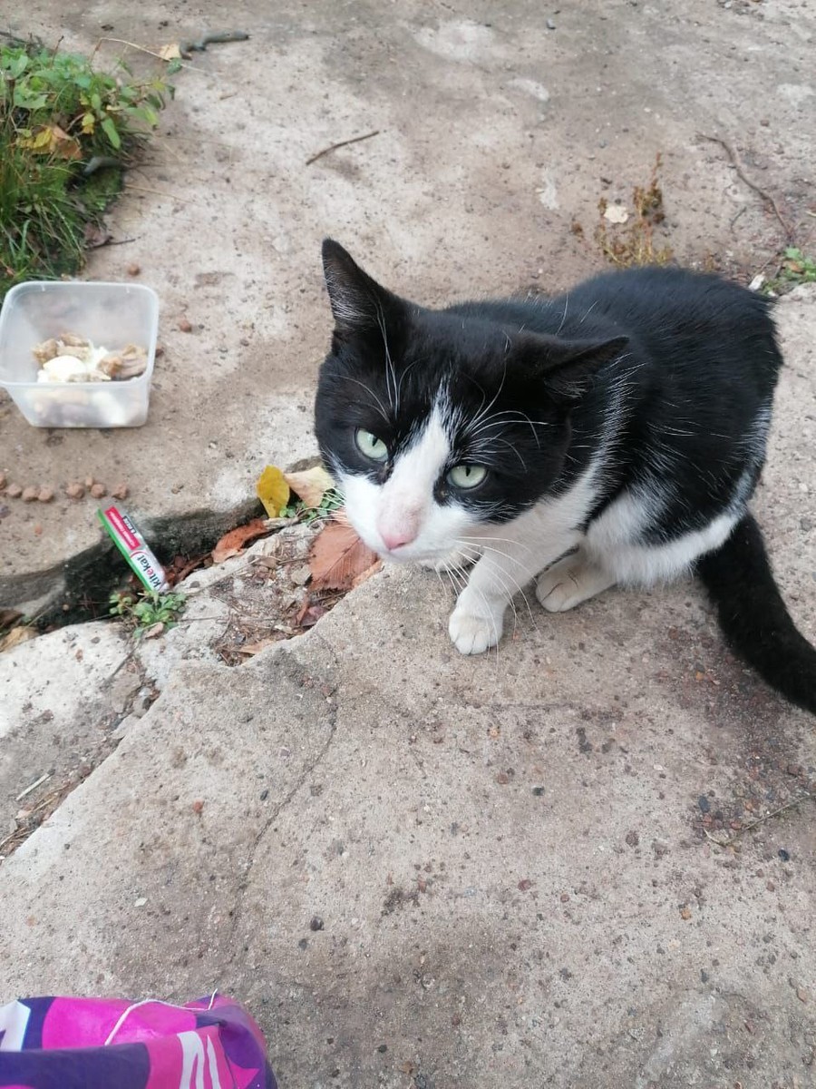 Добавлен новый питомец: Кот с улицы. Несколько дней назад( октябрь 2025) Подвалы закрыты. Кто-то сделал ему домик, так и живёт в нём. Ласковый Скоро морозы...