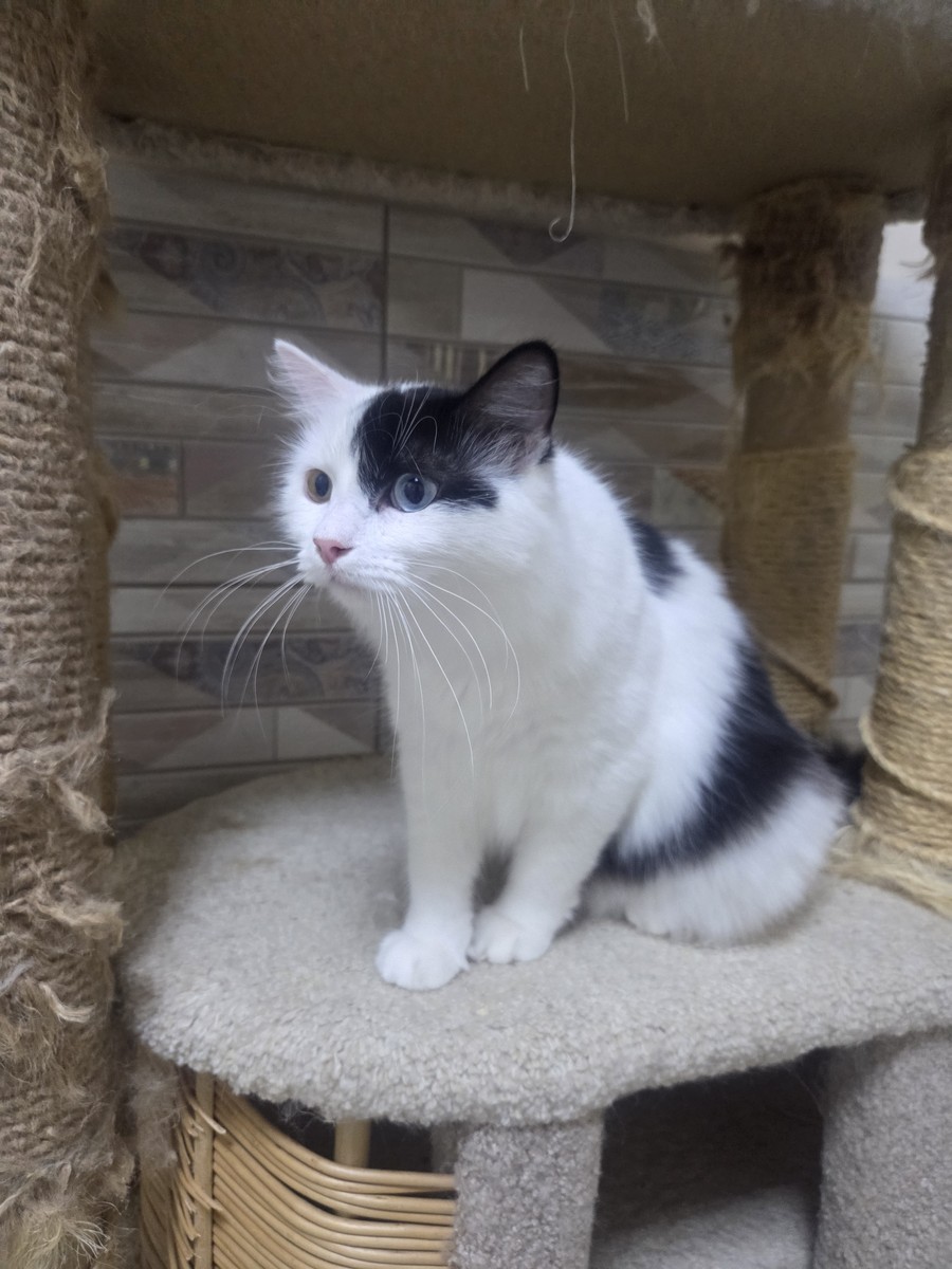 Окрас - бело-черный. Особенность - гетерохромия (разные глаза)