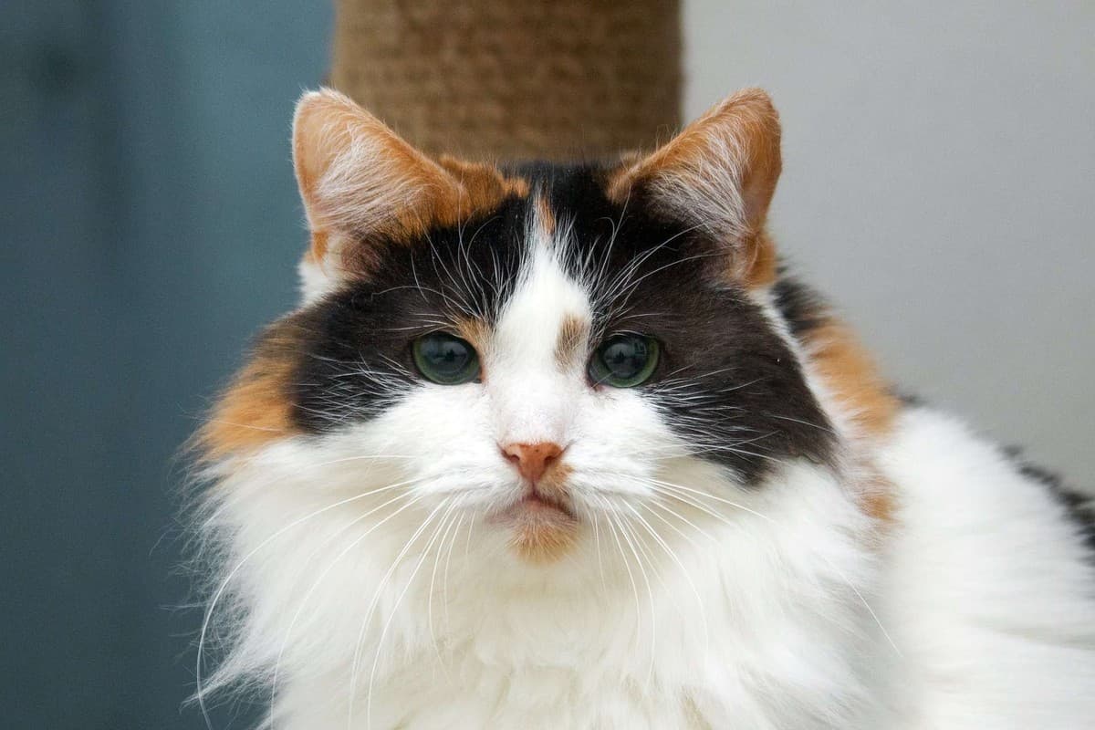 Имеет яркий лоскутный окрас, пушистый хвост и длинные усищи.