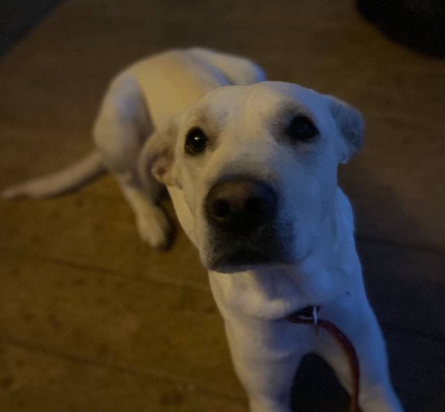 Белый обтянутый кожей скелет Бемби. Этот обтянутый кожей скелет нашли волонтёры. Собака была прикована цепью к забору в глуши. Неизвестно, сколько времени она провела без еды и воды.