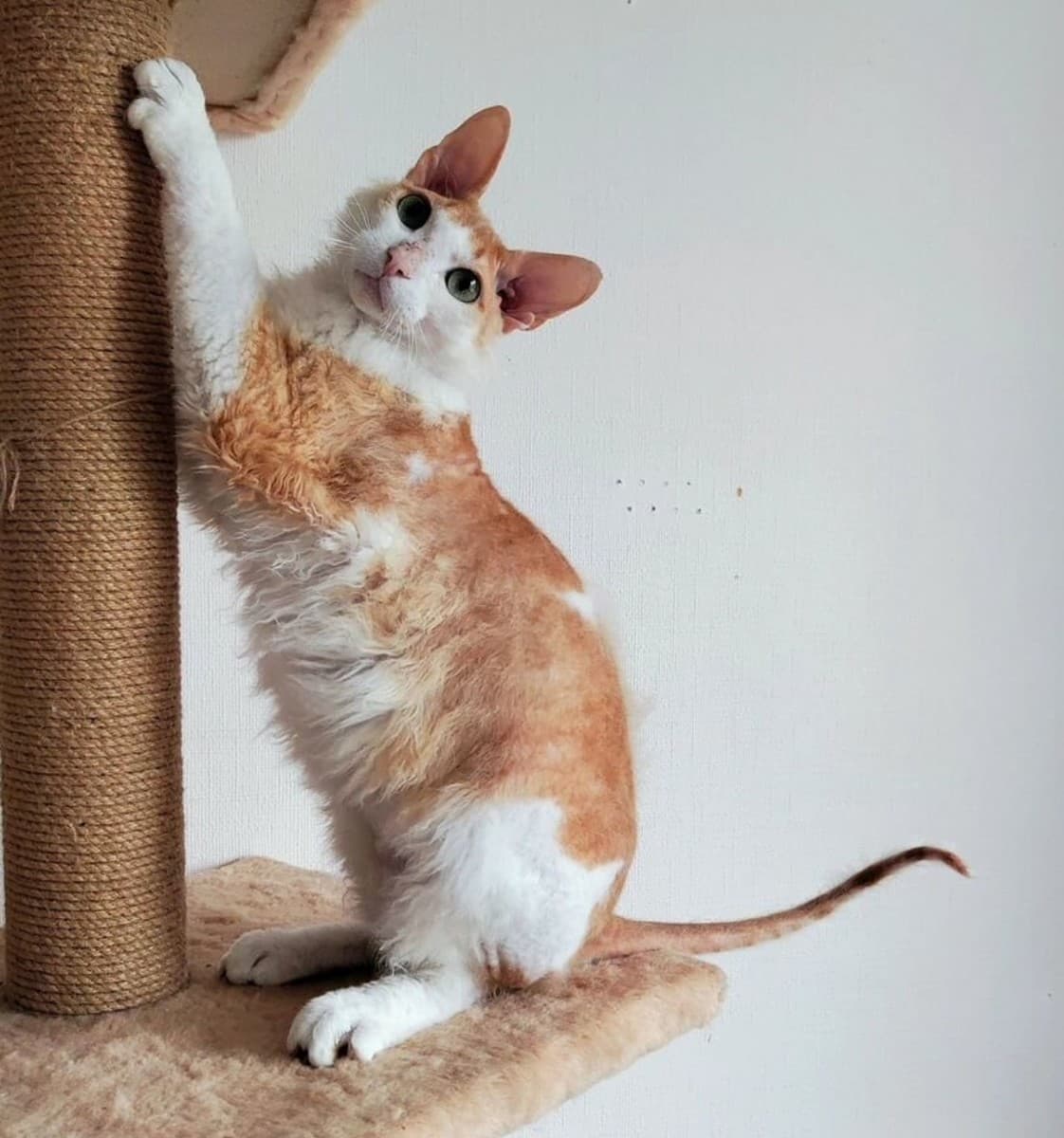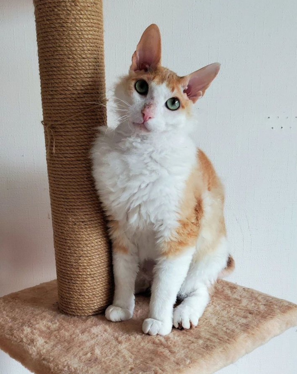 Кудрявому Лучику около 1,5 лет, он кастрирован, привит, обработан от паразитов, ходит в лоток с наполнителем, кушает только качественные сухой и влажный корма. Он молодой котик, поэтому очень игривый. Любит погонять мячики, прятаться в лабиринте или бегать в колесе.