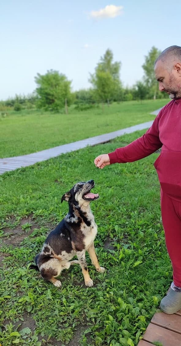 Знает команды сидеть, лапу, рядом и готов изучать новые.